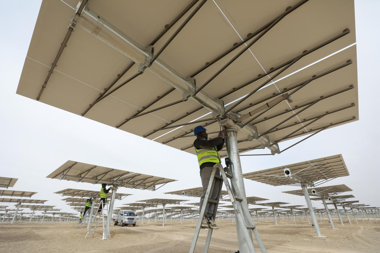 △ 2024年3月12日,甘肅省酒泉市金塔中光太陽(yáng)能10萬(wàn)千瓦光熱+60萬(wàn)千瓦光伏項(xiàng)目現(xiàn)場(chǎng),施工人員有序作業(yè)。