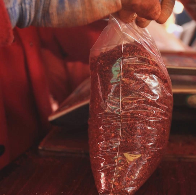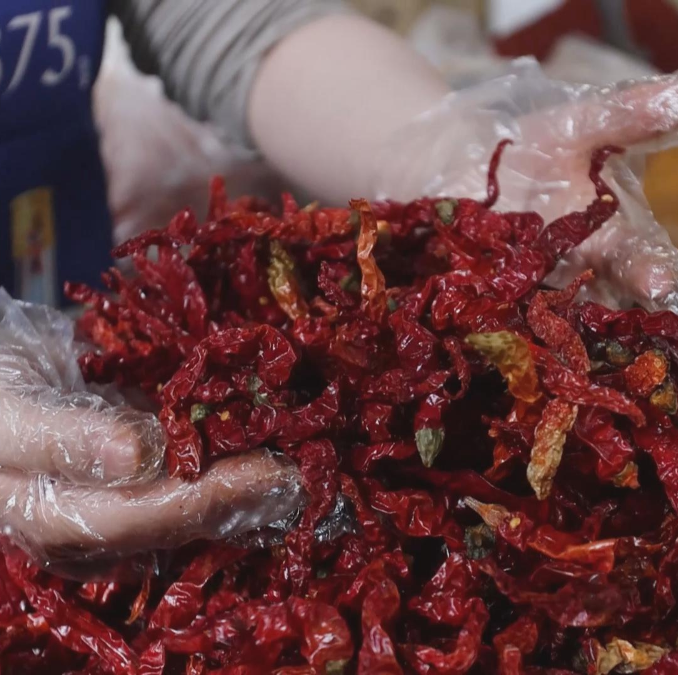 除了靈魂辣椒油,麻辣燙的湯底同樣很重要,由骨湯和多種調(diào)料一起熬制而成,調(diào)料多樣,配比神秘。麻辣燙經(jīng)營者王元琴說,“做麻辣燙需要十幾種材料,花椒、八角、白蔻、小茴香,還有干姜片、草果、良姜等?!背藴渍{(diào)料,最關(guān)鍵的就是辣椒了。海椒和甘谷辣椒按照適量的比例融合,造就了辣椒又香又辣的特點(diǎn)。